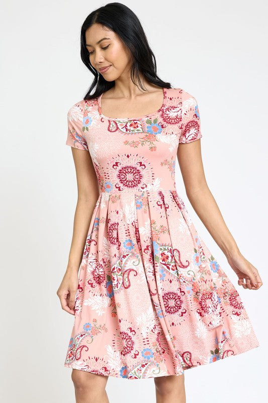 Medallion Short Sleeve Pleated Midi Dress (2 Color Options)
