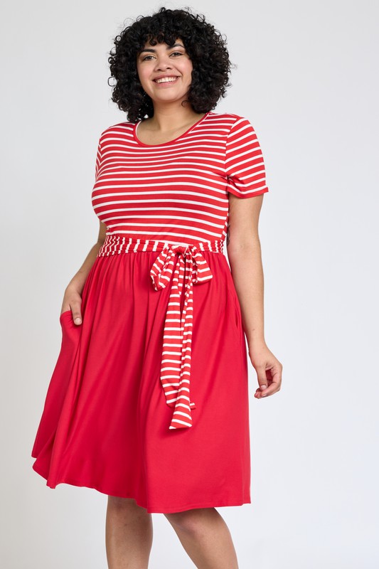 Plus Short Sleeve Stripe Sash Dress (3 Color Options)