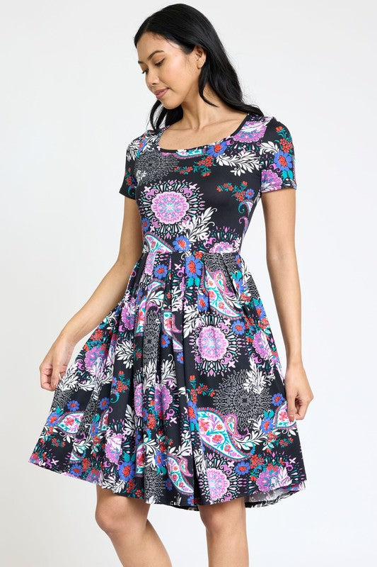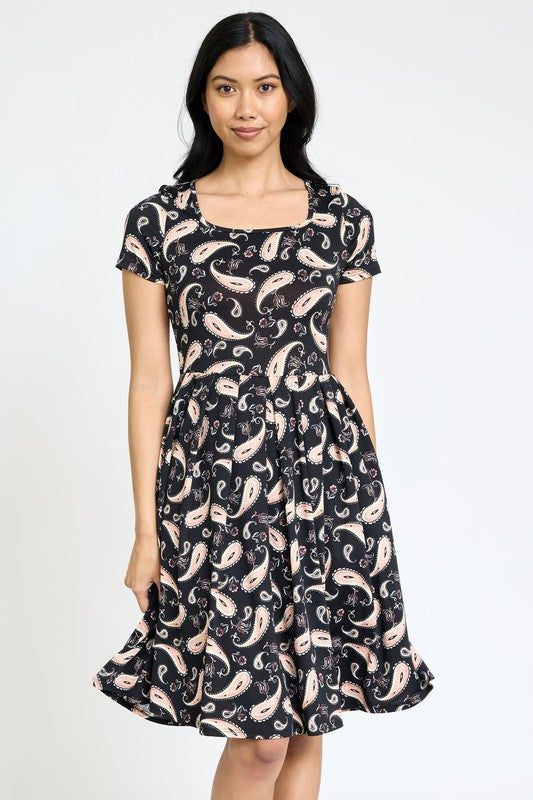 Paisley Short Sleeve Pleated Midi Dress (2 Color Options)