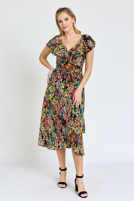 Ruffle Floral V-Neck Midi Dress (2 Color Options)