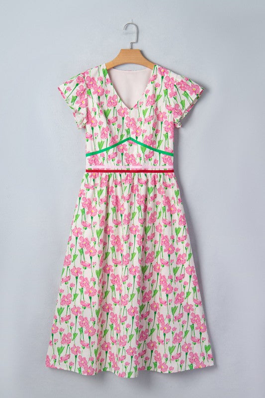 Floral V-Neck Short Sleeve Midi Dress