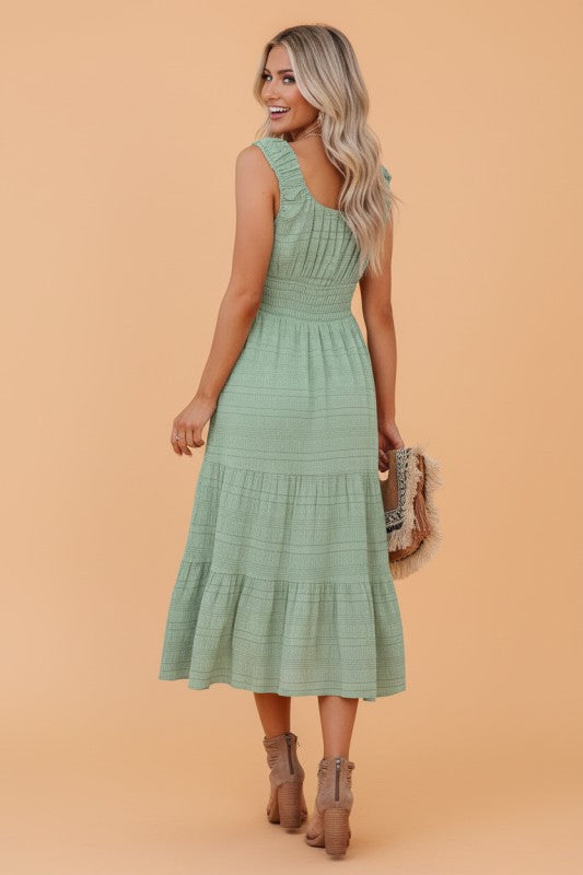 Shirred Pleated Square Neck Sleeveless Midi Dress