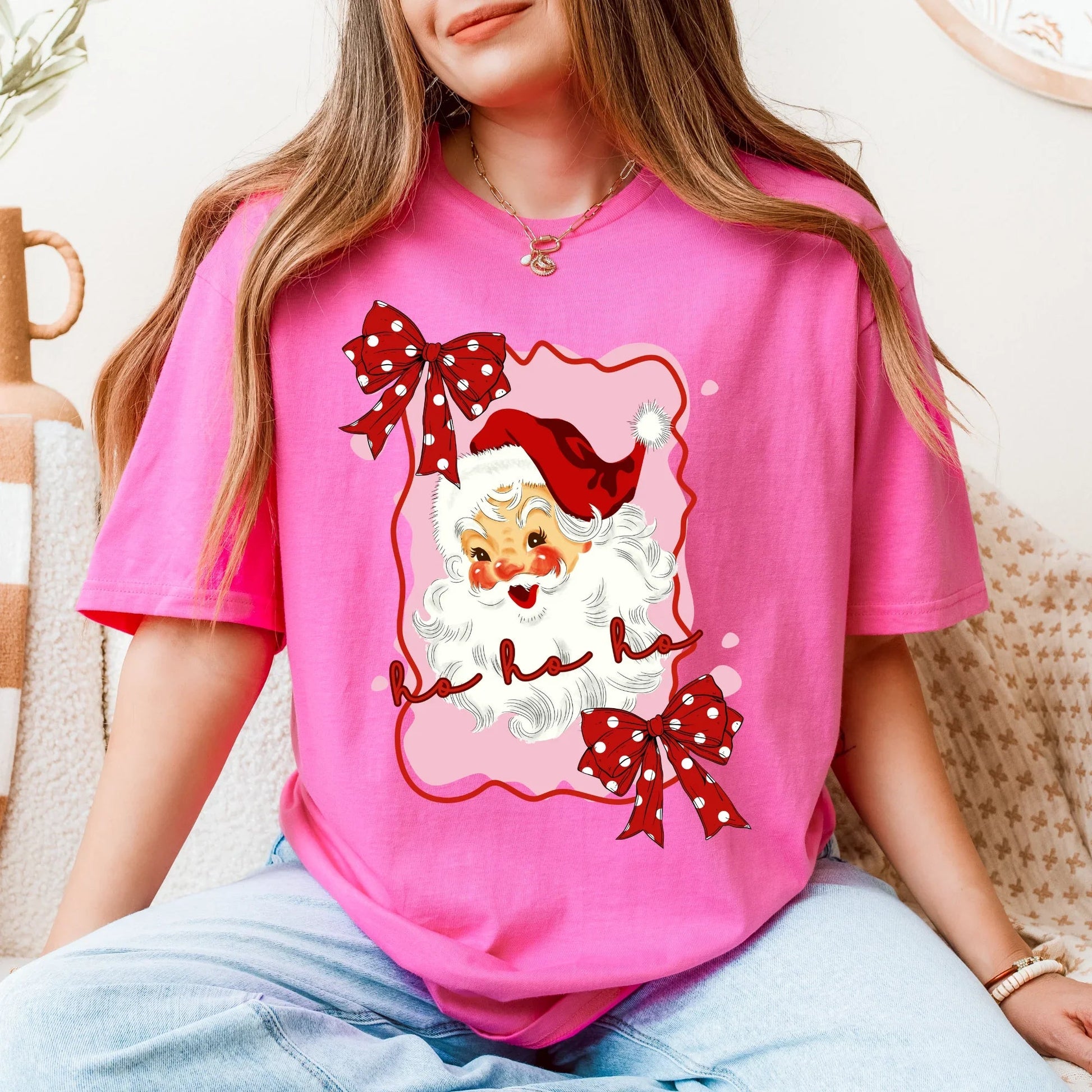 Step into the holiday season with the cutest retro vibes! ๐ This pink and red Christmas tee features a vintage-inspired Santa, dainty bows, and a playful Ho Ho Ho design thatโs full of festive cheer. Perfect for our girlies who love a little retro flair with a modern twist.